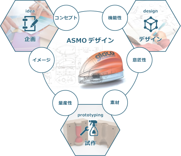 ASMOにおけるプロダクトデザインとは単なる「意匠設計」ではなく、商品企画、コンセプトワークから始まり、イメージ構築、製品設計・デザイン、モデル製作・素材検討を通して、最終地点である商品の完成まで、商品開発をトータルにサポートいたします。